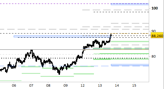 Fino a domani (=livelli di brevissimo periodo) aggiorniamo i supporti a 85.750/850 e 82.500/83.140. Tecnicamente ci sarebbero le condizioni per un'accelerazione fino a 98.450, passando per un primo target intermedio a 91.840. Il segnale è long a mercato e su ritorni al primo supporto. Stop sotto 82.500 senza attendere alcuna conferma.
