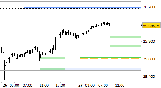 future e.mini Nasdaq, grafico a barre da 30 minuti, prezzi al 27/01/26, ore 9.22, last 25986.75