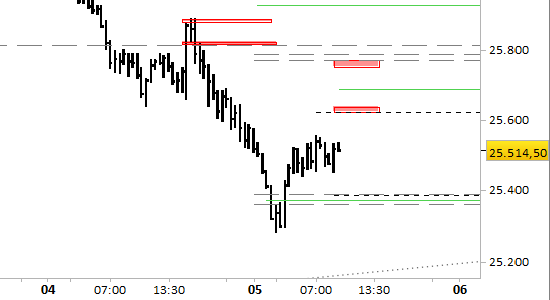 La posizione short aperta ieri a 25682.75 è stata chiusa sul target principale a 25511.00.