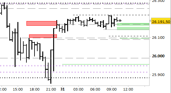 I prezzi hanno raggiunto solo il primo target ribassista, quota 25924.00. La posizione short aperta ieri a 26089.00 è stata liquidata a 26200.25.