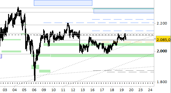 Aggiorniamo il primo supporto di brevissimo periodo, con valenza a 1–2 sedute, a 2050.0; il principale rimane fissato da ieri a 1950.0/1970.0. I prezzi hanno finora impostato l’attesa reazione e conservano attivo un segnale long che proietta un obiettivo a 2262.0. Il segnale resta in vigore solo con rilevazioni stabilmente superiori a 1950.0. Possiamo già premettere che, con prezzi stabilmente inferiori a 1950.0, sarebbe necessario spostare l’attenzione sui punti di verifica immediatamente inferiori, posti a 1860.0/1875.0 e 1790.0.