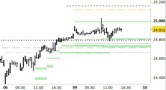 A quota 24995 è posta una robusta resistenza. Ci aspettiamo la rottura rialzista fino a 25165. I supporti che sorreggono lo scenario sono fermi a 24806/24816 e 24715/24725. Il segnale rialzista in vigore resta attivo solo con rilevazioni superiori a 24715.