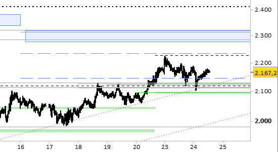 I prezzi stanno effettuando l’attesa reazione dopo il test della zona dei supporti di brevissimo periodo (= 1–2 sedute), ancora fermi fino a domani a 2122.5/2130.0 e 2090.0/2093.0. È ancora attivo un segnale long che proietta un obiettivo a 2227.0; dopo il raggiungimento di questo dovremo attendere segnali. Possiamo già premettere che il punto di verifica immediatamente successivo sarebbe da ricercare a 2285.0. Il segnale long di brevissimo periodo resta attivo con rilevazioni stabilmente superiori a 2090.0.