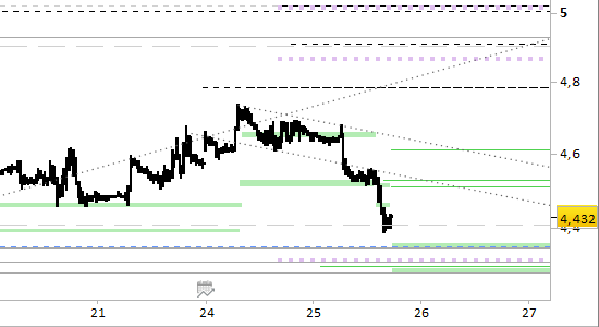 Il segnale tecnico è long su discese a 4.383; stop sotto 4.280 senza attendere alcuna conferma.