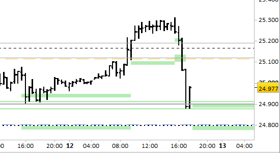 Il segnale rialzista di brevissimo periodo è stato interrotto dalla violazione di 25100. Dobbiamo tuttavia rilevare che si sono già formati nuovi supporti a 24900/910 e 24780/795, e non sono al momento presenti indicazioni tecniche di estensione ulteriore del ribasso a breve. Fino a domani (= brevissimo periodo) ci aspettiamo un recupero a 25114/118, da cui in seguito attenderemo indicazioni. Il nuovo segnale long verrebbe interrotto da prezzi inferiori a 24780.
