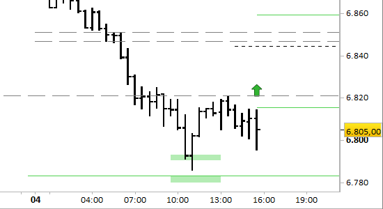Intendiamo intervenire long su semplice violazione rialzista di quota 6821.25, con obiettivi 6844.00 e 6859.00.