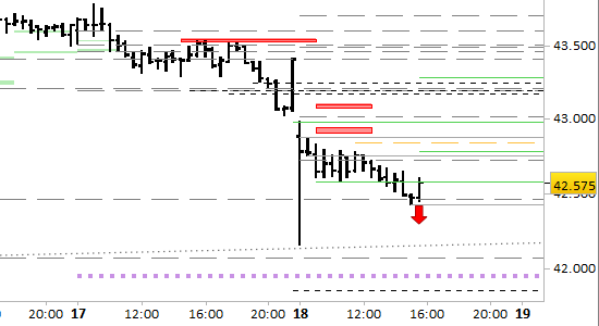 Apriamo short sotto 42420; stop sopra 42780 senza attendere alcuna conferma.