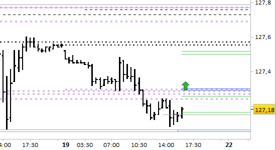 Intendiamo intervenire long su semplice violazione rialzista di 127.30. Obiettivi 127.50 e 127.73/75. Stop sotto 127.05, senza attendere alcuna conferma.