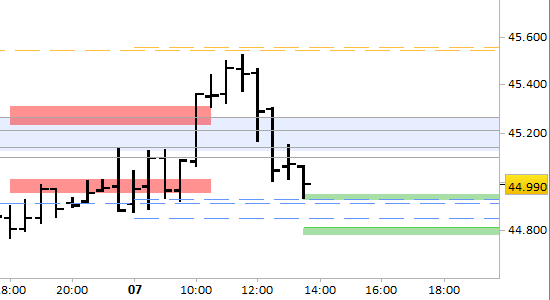 I prezzi hanno raggiunto un inatteso picco a 45520 prima di flettere a 44930. Dobbiamo rivedere tutti i livelli fino al prossimo aggiornamento.