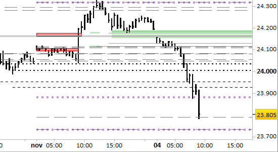 future DAX, grafico a barre da 30 minuti. Prezzi al 04/11/25, ore 9.20, last 23805