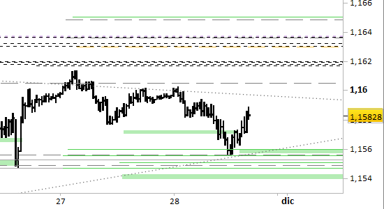 cross eur/usd, grafico a barre da 30 minuti. Prezzi al 28/11/25, ore 16.21, last 1.1582
