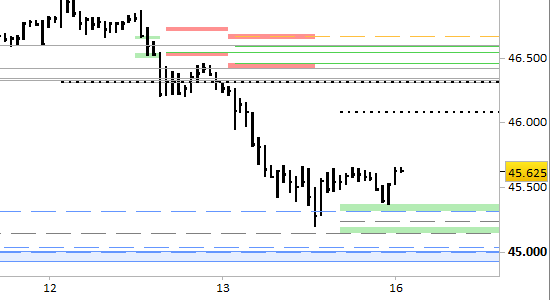 Lo scenario è inattto rispetto l'ultimo aggiornamenmto di venerdì. Nel brevissimo periodo (=prossime ore) ci sono le condizioni per un recupero fino a 46085. I supporti sono fermi a 45350/45370 e 45140/45160. Il segnale long di brevissimo periodo verrebbe annullato da prezzi inferiori a 45140.