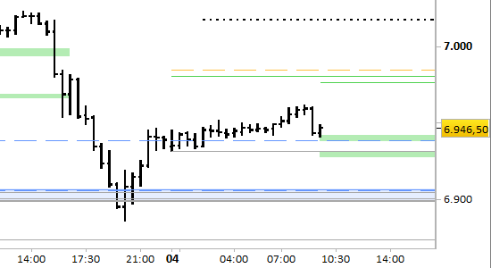 Per il brevissimo periodo (= sessione odierna) fissiamo dei supporti a 6938.50/40.00 e 6927.50/31.00, che dovremo tenere strettamente monitorati in quanto mantengono attivo un segnale long fino a 6976.50, prima resistenza. Dopo il raggiungimento della resistenza dovremo attendere segnali per le prossime analisi. Sarebbe sufficiente la semplice violazione di 6927.50 per aprire la strada a un nuovo test del supporto di tendenza, che imporrebbe un aggiornamento dello scenario di brevissimo periodo con i prossimi bollettini.