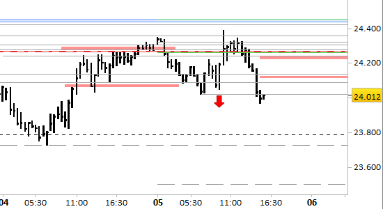 future DAX, grafico a barre da 30 minuti. Prezzi al 05/03/26, ore 15.30, last 24012