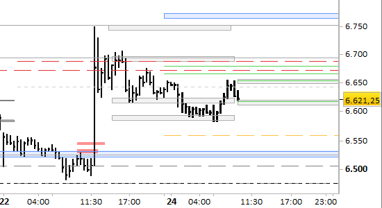 e.mini S&P future, grafico a barre da 30 minuti. Prezzi al 24/03/26, ore 9.57, last 6621.25