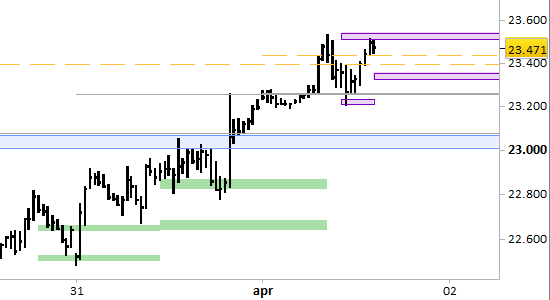 future DAX, grafico a barre da 30 minuti. Prezzi al 01/04/26, ore 14.15, last 23471