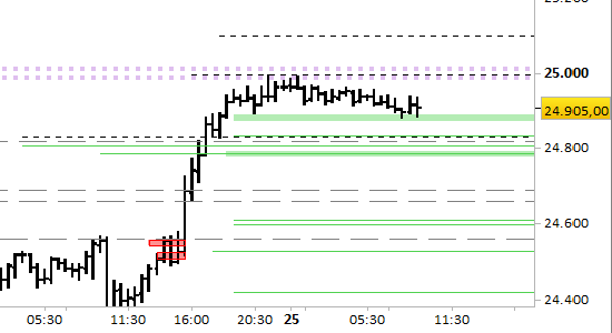 Conserviamo la posizione long aperta a 24884.75; stop sotto 24775.00 senza attendere alcuna conferma.