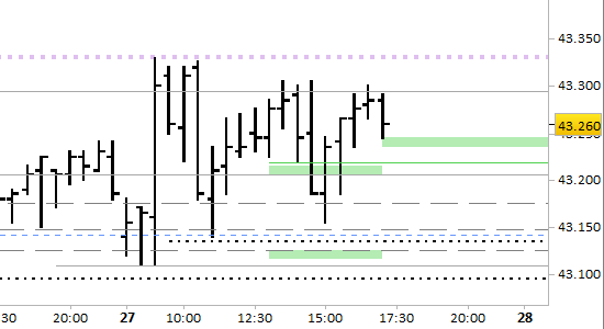 Conserviamo la posizione long aperta a 43240; stop sotto 43235 senza attendere alcuna conferma.