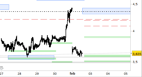 future natural gas, grafico a barre da 30 minuti. Prezzi al 02/02/26, ore 12.41, last 3.635