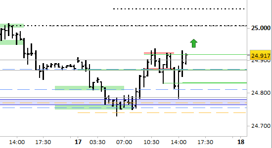 Dopo l'ultimo aggiornamento i prezzi si sono mossi al ribasso fra 24934 e 24785, salvo poi recuperare fino a 24930. Dobbiamo rivedere la disposizione dei riferimenti di brevissimo periodo, alla luce della maggiore volatilità delle ultime ore. Lo spazio fra i nuovi supporti a 24868/872 e 24830, e la resistenza a 24940, è zona di provvisoria stabilizzazione. Attendiamo la formazione di un segnale rialzista dal semplice superamento di 24940; a tale condizione si formerebbero proiezioni fino a 25007 e 25059, e il segnale verrebbe annullato solo da un successivo ritorno sotto 24830.