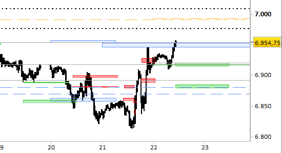 L'impostazione di brevissimo periodo pare favorevole alla rottura definitiva della resistenza di tendenza in corso di seduta. sono attive proiezioni rialziste fino a 7010.00, sorrette dai supporti daily a 6915.00/20.00 e 6879.50. Solo prezzi inferiori a quest'ultimo livello potrebbero imporre una revisione allo scenario di brevissimo periodo. Il segnale tecnico è long, preferibilmente sfruttando un eventuale riavvicinamento ai supporti, da prezzi non superiori a 6934.00.