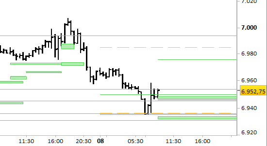 Il segnale è long a mercato e su test del primo supporto. Stop sotto 6931.00 senza attendere alcuna conferma.
