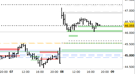I prezzi hanno toccato minimi a 46050 prima di risalire sopra a entrambi i supporti, confermati fino all'aggiornamento di domattina a 46310/330 e 46050.