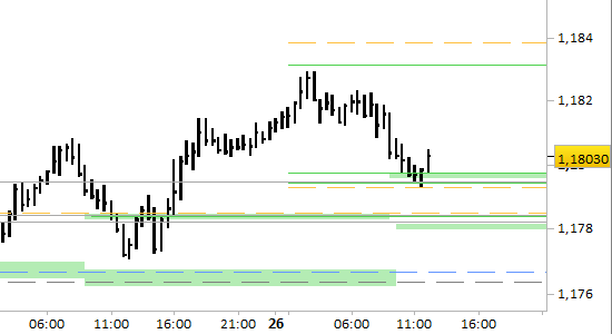 cross eur/usd, grafico a barre da 30 minuti. Prezzi al 26/02/26, ore 12.13, last 1.1803
