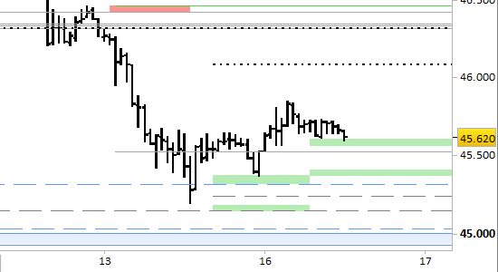 I prezzi si sono riavvicinati alla zona dei supporti di brevissimo periodo (= prossime ore) posti a 45590/45600 e 45370/45390. Ci sono le condizioni per l’ampliamento del recupero fino a 46085. Il segnale long di brevissimo periodo resta attivo solo con rilevazioni stabilmente superiori a 45370.