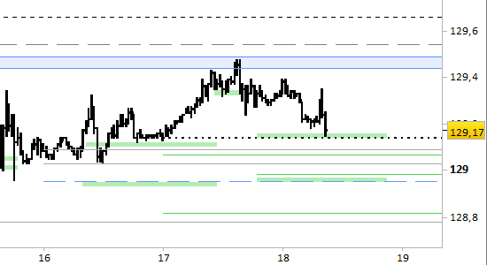 I prezzi hanno effettuato l’atteso riavvicinamento ai supporti di brevissimo periodo (= sessione odierna). I supporti sono confermati a 129.14/16 e 128.95/129.00 e sono probabili punti di reazione. Le proiezioni indicano un target a 129.65. Il segnale long di breve è attivo solo con prezzi stabilmente superiori a 128.95.