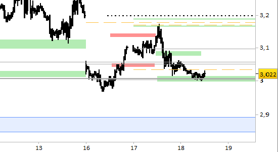 future natural gas, grafico a barre da 30 minuti. Prezzi al 17/02/26, ore 12.17, last 3.022