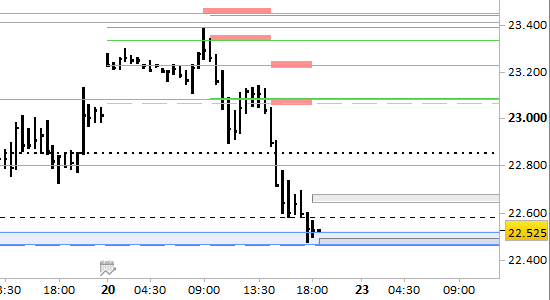 I riferimenti più prossimi vanno aggiornati a 22460/470 (supporto) e 22670/680 (resistenza); lo spazio fra questi livelli rappresenta probabile zona di stabilizzazione per le prossime ore.