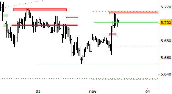 future Eurostoxx50, grafico a barre da 30 minuti. Prezzi fino al 03/11/25, ore 11.30, last 5702