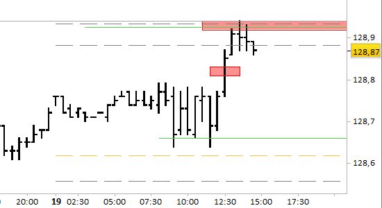 Conserviamo la posizione short aperta a 128.70; stop sopra 128.95 senza attendere alcuna conferma.