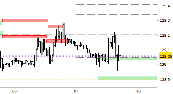 I prezzi si trovano a contatto con la zona dei supporti, fermi a 129.05/08 e 128.90/95.