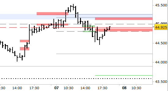 I prezzi si sono portati entro l'area tra le resistenze ancora valide fino all'aggiornamento di domattina, poste a 44800/44820 e 45180/45200. Si tratta di una zona da cui ci aspettiamo a breve la ripresa della pressione ribassista.