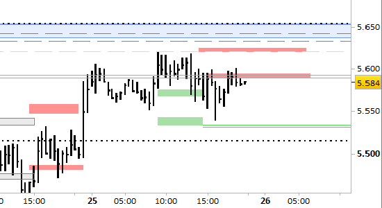 future Eurostoxx50, grafico a barre da 30 minuti. Prezzi fino al 25/03/26, ore 19.35, last 5584