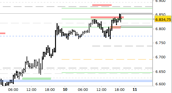 L’inattesa violazione rialzista dell’ex resistenza principale di breve periodo a 6843.00 ha determinato l’interruzione almeno provvisoria del segnale short a 1-2 giornate. Si sono formati livelli di verifica a 6852.00/6856.00 (resistenza) e 6805.00/6808.00 (supporto), da cui dobbiamo adesso attendere la formazione di nuove indicazioni tecniche direzionali. Per il momento lo spazio compreso tra questi due livelli è zona di probabile stabilizzazione; rimaniamo in osservazione.