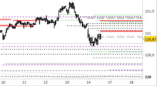 La posizione long aperta ieri a 121.47 è stata chiusa in stop a 121.27. I prezzi sono stati respinti contro le attese dalla resistenza a 121.67/121.70, segnando minimi a 120.70.